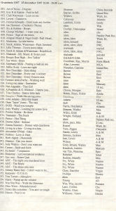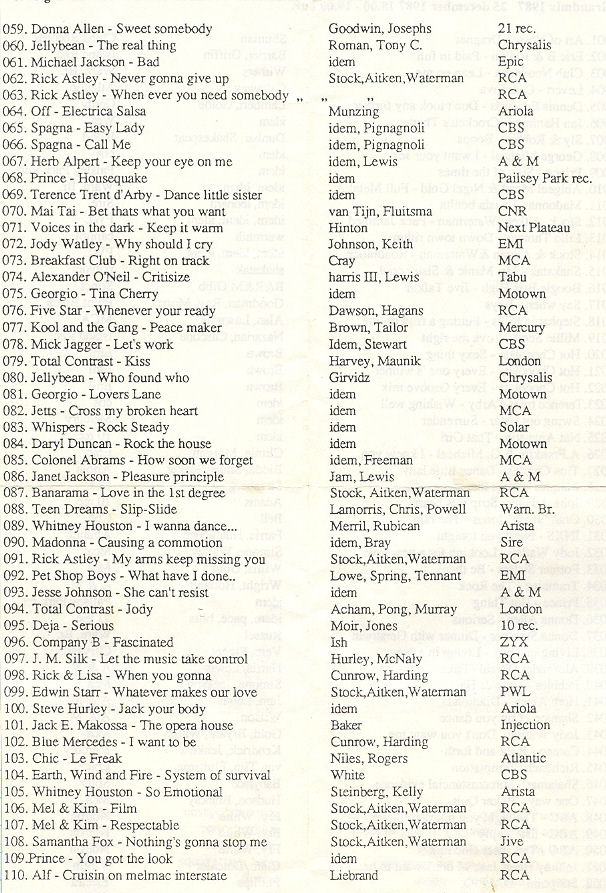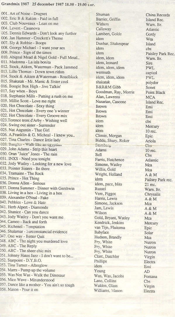 071. Mai Tai - Bet That's What You Say 072. Voices In The Dark - Keep It Warm 073. Nona Hendryx - Why Should I Cry 074. Breakfast Club - Right On Track 075. Alexander O' Neal - Criticize 076. Georgio - Tina Cherry 077. Five Star - Whenever Your Ready 078. Kool & The Gang - Peacemaker 079. Mick Jagger - Let's Work 080. Total Contrast - Kiss 081. Georgio - Lover's Lane 082. Jellybean - Who Found Who 083. The Jets - Cross My Broken Heart 084. The Whispers - Rock Steady 085. Daryl Duncan - Rock The House 086. Colonel Abrams - How Soon We Forget 087. Janet Jackson - Pleasure Principle 088. Bananarama - Love In The 1st Degree 089. Teen Dreams - Slip-Slide 090. Whitney Houston - I Wanna Dance With Somebody (Who Loves Me) 091. Madonna - Causing A Commotion 092. Rick Astley - My Arms Keep Missing You 093. Pet Shop Boys & Dusty Springfield - What Have I Done To Deserve This 094. Jesse Johnson - She (I Can't Resist) 095. Total Contrast - Jody 096. Deja - Serious 097. Company B - Fascinated 098. J.M. Silk - Let The Music Take Control 099. Rick & Lisa - When You Gonna 100. Edwin Starr - Whatever Makes Our Love Grow 101. Steve "Silk" Hurley - Jack Your Body 102. Blue Mercedes - I Want To Be 103. Jack E. Makossa - The Opera House 104. Chic - Jack Le Freak 105. Earth, Wind & Fire - System Of Survival 106. Whitney Houston - So Emotional 107. Mel & Kim - F.L.M. 108. Mel & Kim - Respectable 109. Samantha Fox - Nothing's Gonna Stop Me Now 110. Prince - U Got The Look 111. Ben Liebrand - Cruisin On Melmac Interstate Na de uitzending van de Grandmix was het mogelijk om bij Ben Liebrand zelf de tracklist op te vragen. Die kreeg je dan netjes uitgetypt thuisgestuurd. Hier zijn de scans uit 1987: Aanvullende informatie over de Grandmix 1987 >> |