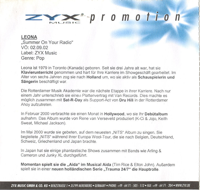 Roxanna - Number One (Summer In The City) Type: 5 Inch CD-single Label: Indisc (DICD-7997) Tracklisting: 1. Number One (Summer In The City) / 3:28 2. Number One (Summer In The City) (12"Remix) / 6:15 3. The Basside / 3:20 All songs composed, arranged and produced by Ben Liebrand [aanvullende info >>>] |