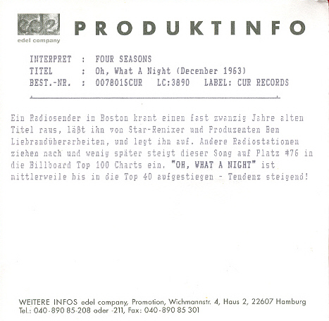Compact! 3/91 (promo) Type: 5-Inch CD-single Label: BMG Ariola (261336) Land: Duitsland Tracklisting: 01. Dr. Alban - No Coke (7" Mix) / 3:43 02. Karl Keaton - Love's Burn (Dancemix Radio Edit) / 4:28 * 03. Linda Layton - Echo My heart / 4:27 04. Michael Fitzen - Harte Zeiten / 3:17 05. Udo Jürgen, Sonja Kimmons & Yvonne Moore - Wings Of Love / 3:57 06. Ricky Dandell - Dann Laß Ich Dich Geh'n / 3:35 07. John Lee Hooker/Miles Davis/Taj Mahal - Bank Robbery / 4:31 08. City - Morgenmond / 3:15 09. Julian Cope - Beautiful Love / 3:12 10. Bronski Beat - One More Chance (7" Version) / 4:32 11. Vaya Con Dios - Night Owls / 3:56 12. Engelbert - Take Away The Sorrow / 3:05 13. Carly Simon - Life Is Eternal (Single Edit) / 4:10 14. Womack & Womack - Uptown (Single Version) / 4:15 * Produced and mixed by Ben Liebrand. |